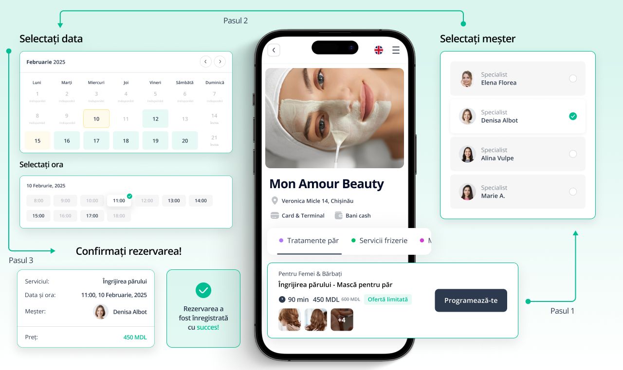 - Programări online 24/7 – clienții pot rezerva oricând, fără apeluri și mesaje.