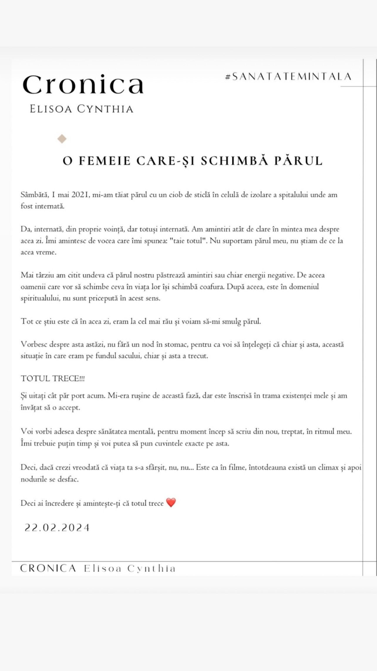 Povestea din spatele frizurii spontane este una profundă. Astfel, influencerița a publicat pe Instagram un fragment dintr-o cronică de-a sa, despre sănătatea mintală.