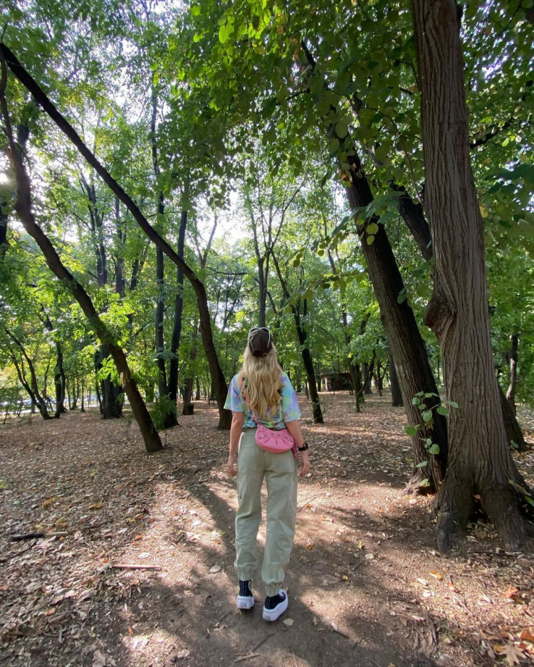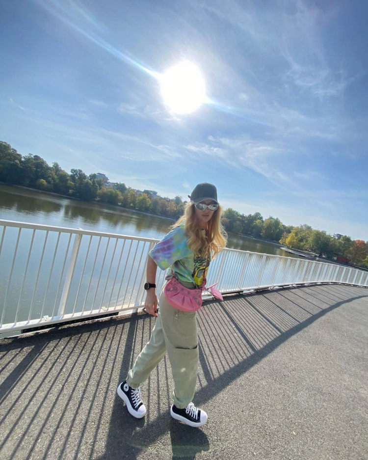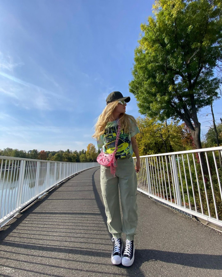 Artista a purtat o pereche de pantaloni kaki cu talie inalta, pe care i-a asortat cu un tricou colorat si o pereche de pantofi sport negri cu talpa inalta. Cantareata nu a uitat nici de accesorii, astfel ca a adaugat tinutei o sapca inchisa la culoare si o pereche de ochelari de soare „cool”. Geanta aleasa de artista a fost cireasa de pe tort, fiindca aceasta a ales o poseta roz bombon, copilareasca. Dupa plimbarea din parc, Delia s-a oprit la o terasa, unde a savurat cafeaua sa preferata si a postat totul pe contul sau de Instagram.
