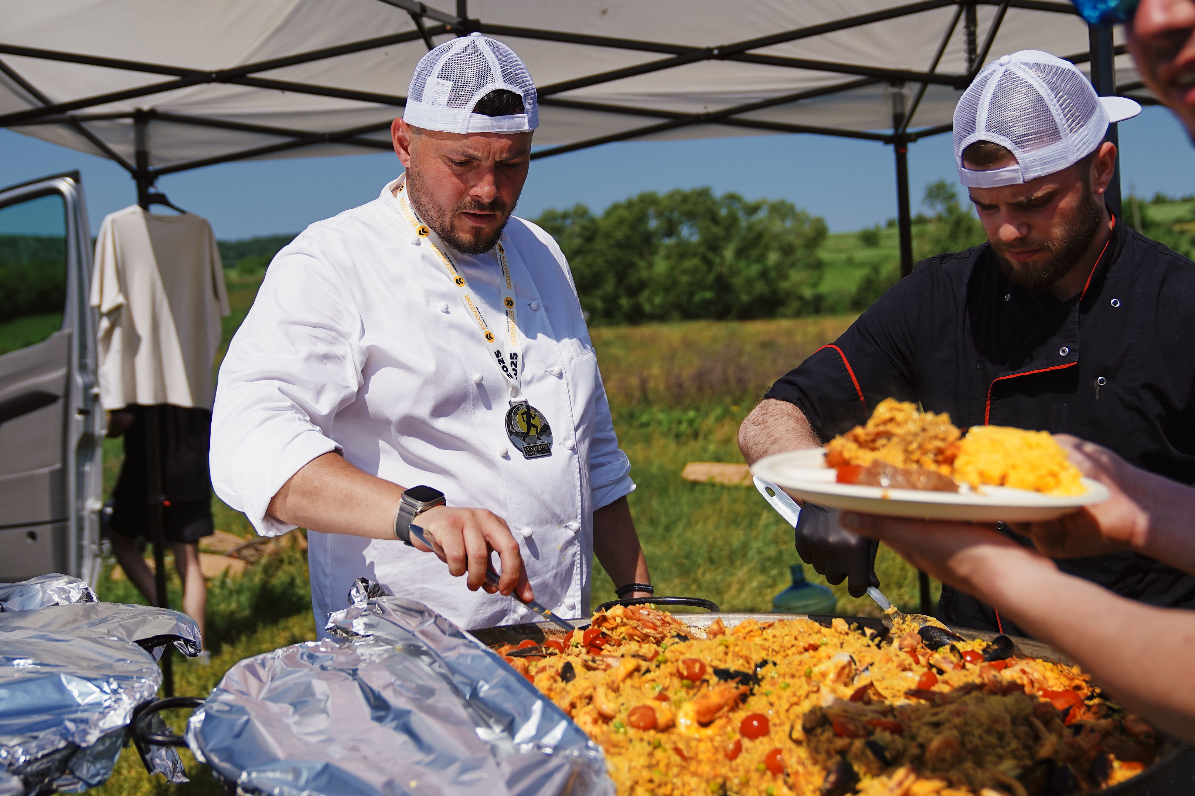 Alexandru Comerzan a pregătit cea mai delicioasă mâncare pentru invitaţi şi maratonişti. „Avem mămăligă cu brânză ca la bunica acasă și un pic de usturoi, ăsta este secretul nostru când facem mămăliga. Avem o tocăniță din purcel și bineînțeles, o paella cu fructe de mare. Gătitul l-am început la ora 8. Ne-am lămurit mai întâi cu mămăliga pentru că, procesul durează și trebuie să se gătească un pic mai mult, după care tocănița și paella. Faptele bune unesc oamenii buni și cred că și de asta ne-am aducat aici. În primul rând, să facem o faptă bună, iar Ecovzor face o chestie extraordinară. Combinăm sportul cu mâncărica gustoasă”, a menționat Alexandru Comerzan, chef.