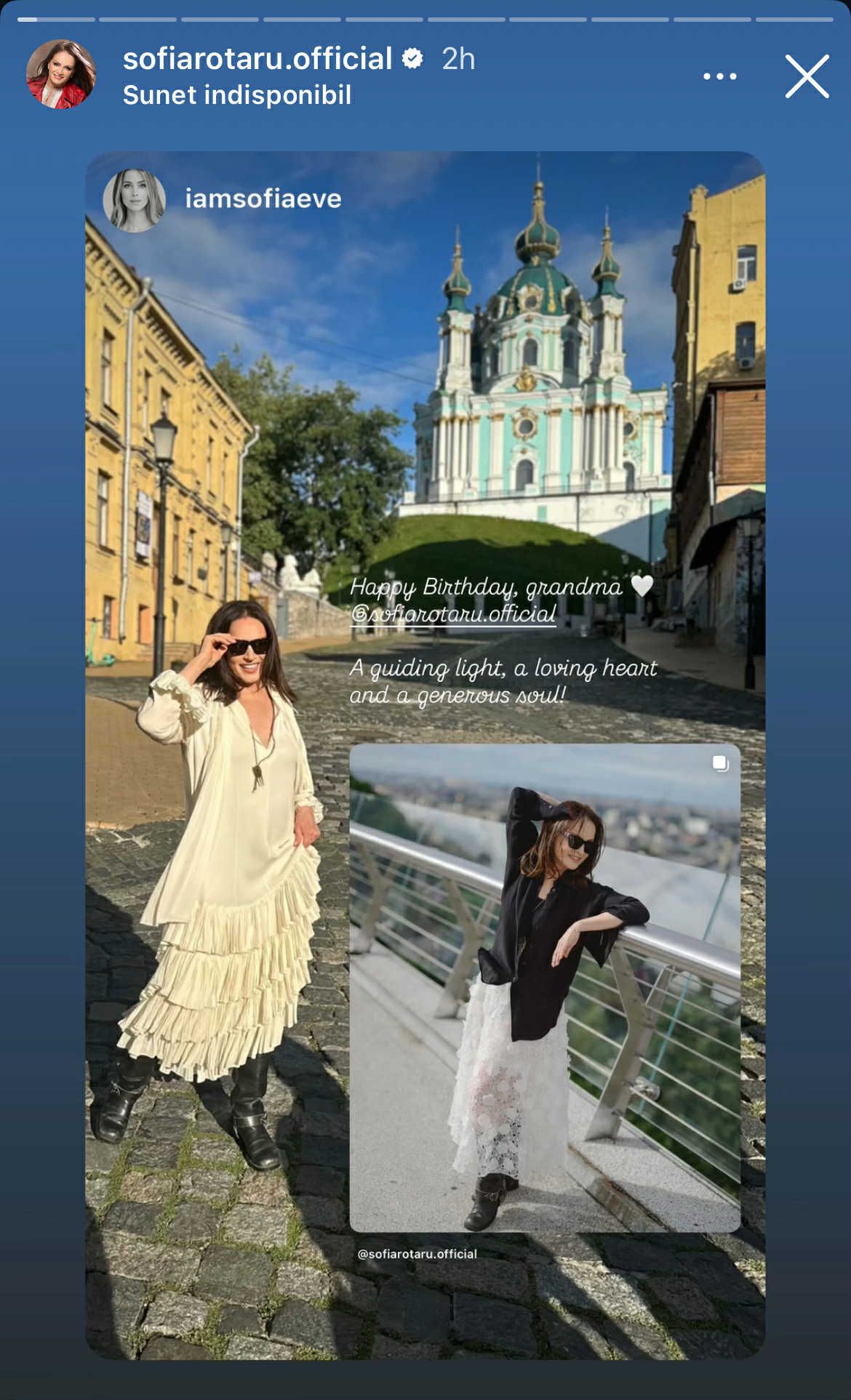 Sofia Rotaru a primit deja o felicitare plină de dragoste din partea nepoatei sale, care, de altfel, îi poartă și numele. Sofia Evdokimenko a distribuit câteva fotografii recente cu bunica sa, iar în descriere a menționat: