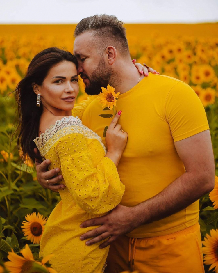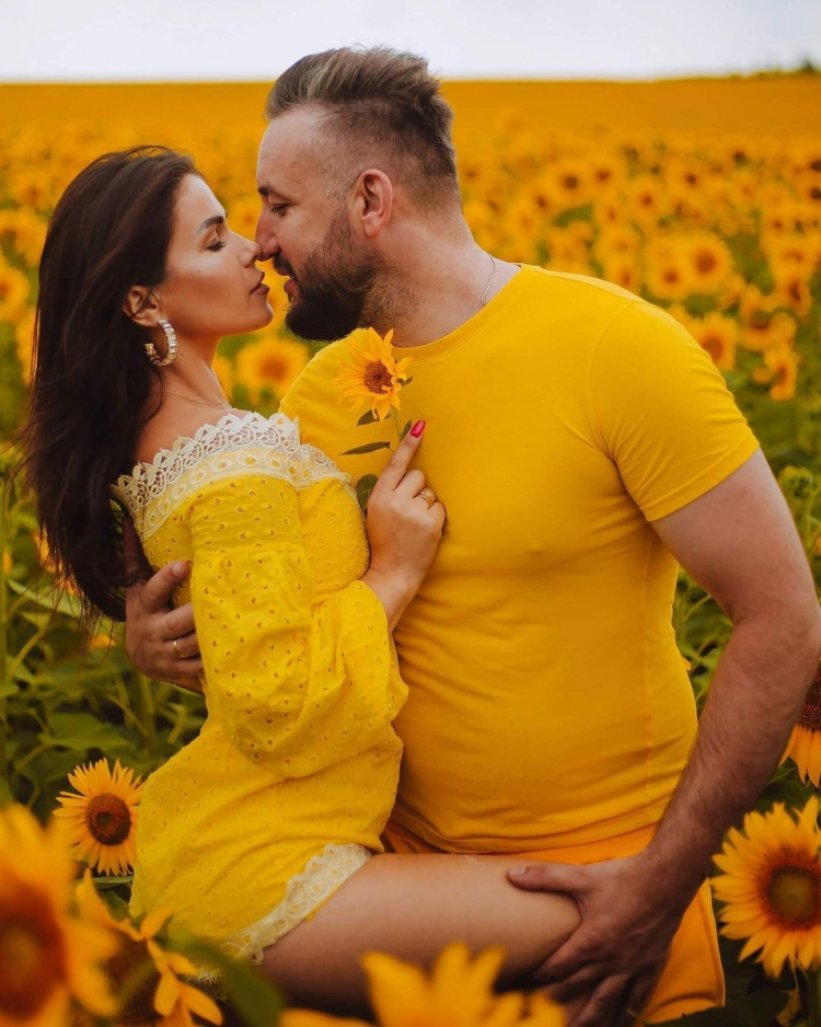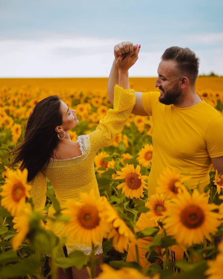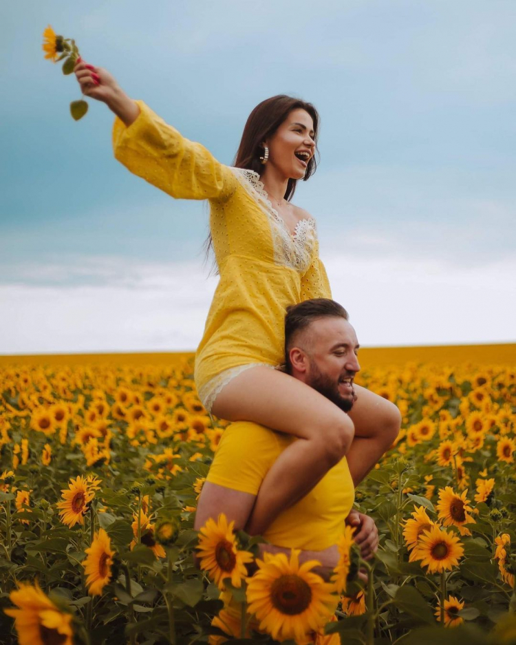 Mie mi-o ofera cele mai simple lucruri, unul dintre ele a fost chiar sesiunea aceasta in lanul cu floarea soarelui. Ma bucura faptul ca putem petrece impreuna cu sotul, uitand de toate grijile, alergand pe pamantul umed dupa ploaie printr-un lan pe care l-am “ochit” de departe mergand pe treburile noastre. Imi place nespus de mult aceasta serie de fotografii, mi se pare ca transmite fericire si emotii frumoase.”, a scris Tatiana.