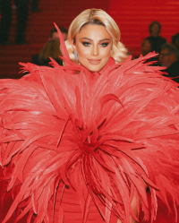 Interpreta a optat pentru o rochie roșie, lungă cu un croi de tip sirenă și cu trenă cochetă. Însă extravaganța se datorează compoziției din partea superioară a rochiei. O mulțime de pene roșii enorme i-au îmbogățit ținuta.