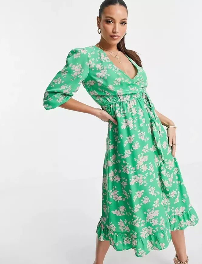 Un must-have pentru orice garderoba de vara este o rochie midi florala romantica. Acest model poate fi completat cu sandale albe, o geanta mica si o palarie de paie.