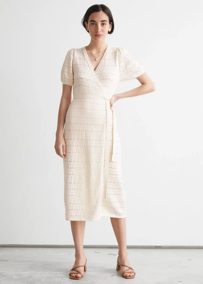O rochie cremoasa din jerseu pointelle ajurat este un hit al acestei veri. Aproape orice pereche de pantofi i se vor potrivi, fie ca sunt sandale masive, adidasi sau sandale gratioase.