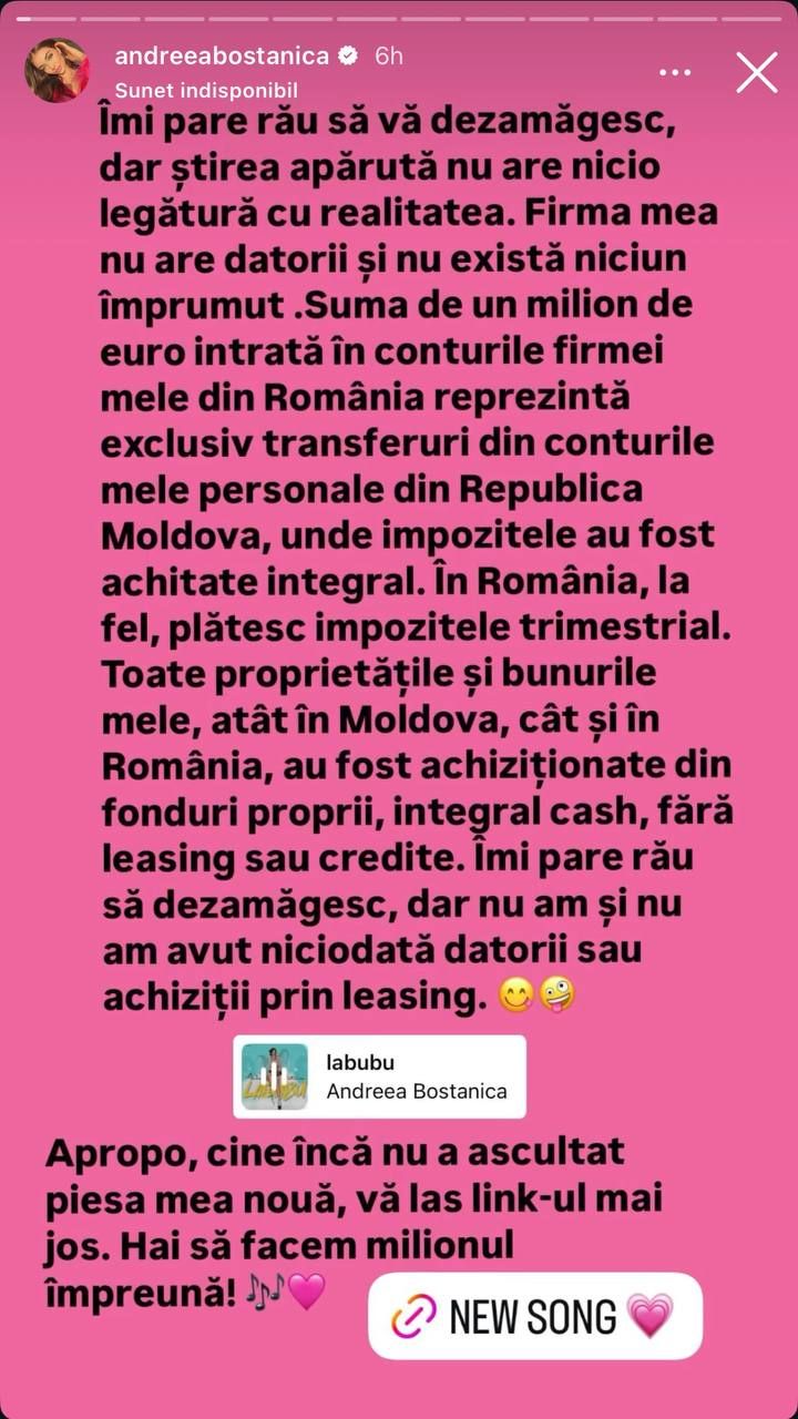 Pentru a pune capăt speculațiilor, Andreea Bostanica a publicat un mesaj pe contul său de Instagram, în care a negat categoric informațiile apărute: