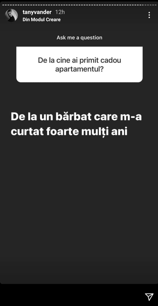 Intr-o noua sesiune de intrebari si raspunsuri, Tany a fost intrebata de la cine a primit cadou apartamentul, iar aceasta a raspuns pe scurt: „De la un barbat care m-a curtat foarte multi ani”, semn ca a avut parte de atentie deosebit din partea celui care o placea.