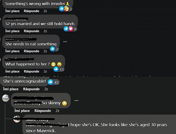 „Arata anormal de slaba”; „E de nerecunoscut”; „Atat de slaba”; „Sper ca e OK. Arata ca si cum a imbatranit 30 de ani de la Top Gun: Maverick”; „Se intampla ceva rau cu Jennifer” - au fost cateva dintre mesajele celor care s-au aratat ingrijorati.