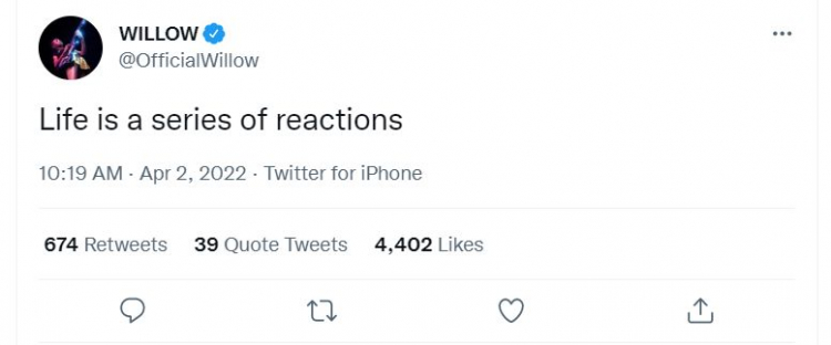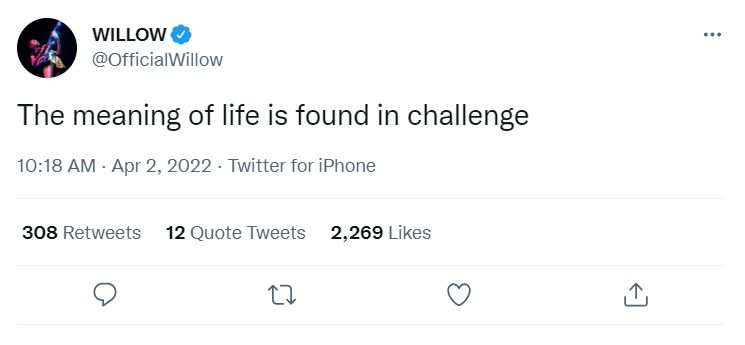 „Sensul vietii se gaseste in provocare. Viata este o serie de reactii”, a scris pe contul sau de Twitter Willow Smith, co-gazda emisiunii Red Table Talk.
