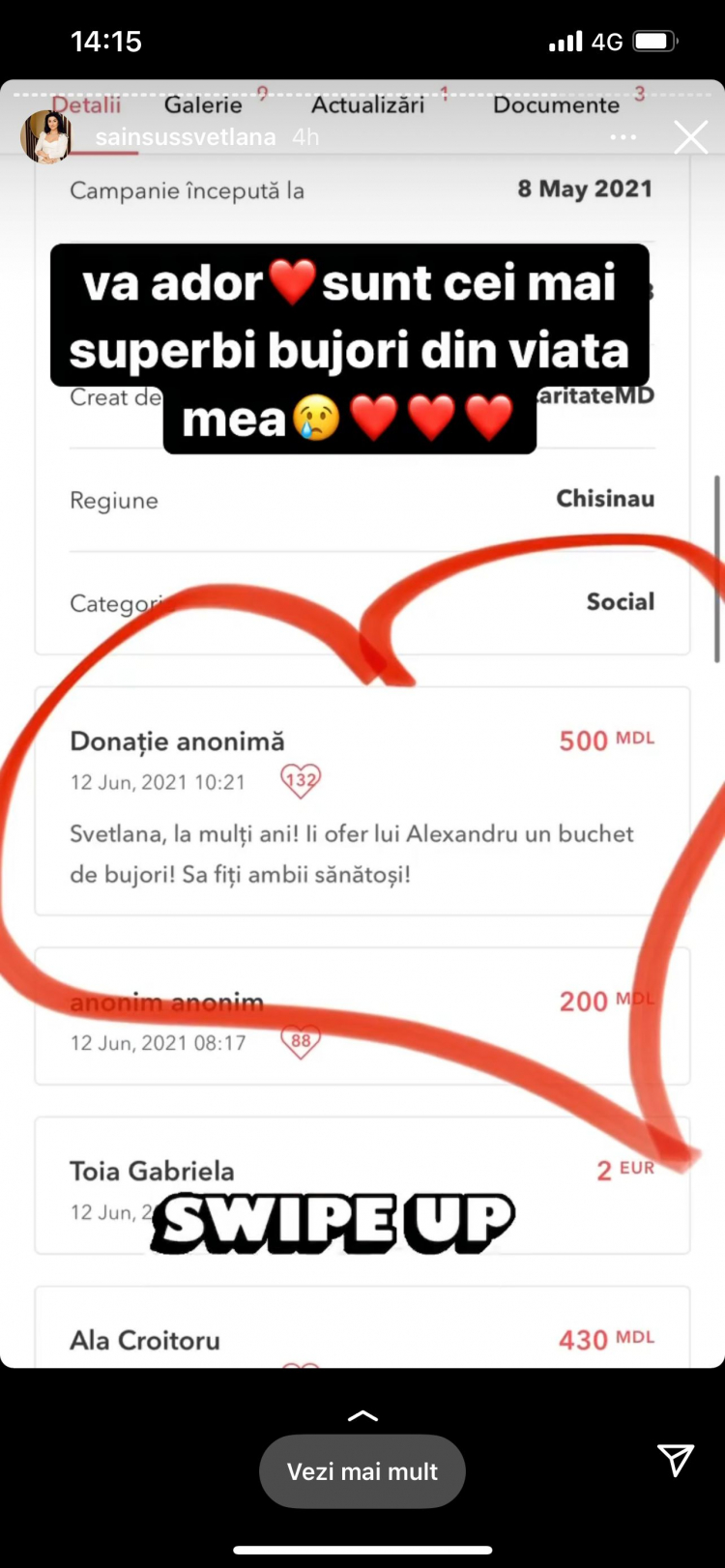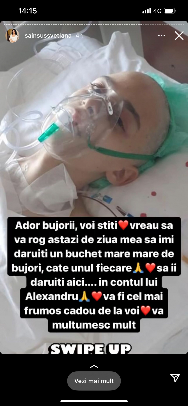Pe pagina sa de Instagram, Svetlana si-a rugat urmaritorii sa nu-i daruiasca flori ei, insa sa doneze in contul lui Alexandru. Baiatul este surd, are cancer si i-a fost amputata o mana. Nu poate folosi deja nici limbajul surdomut.