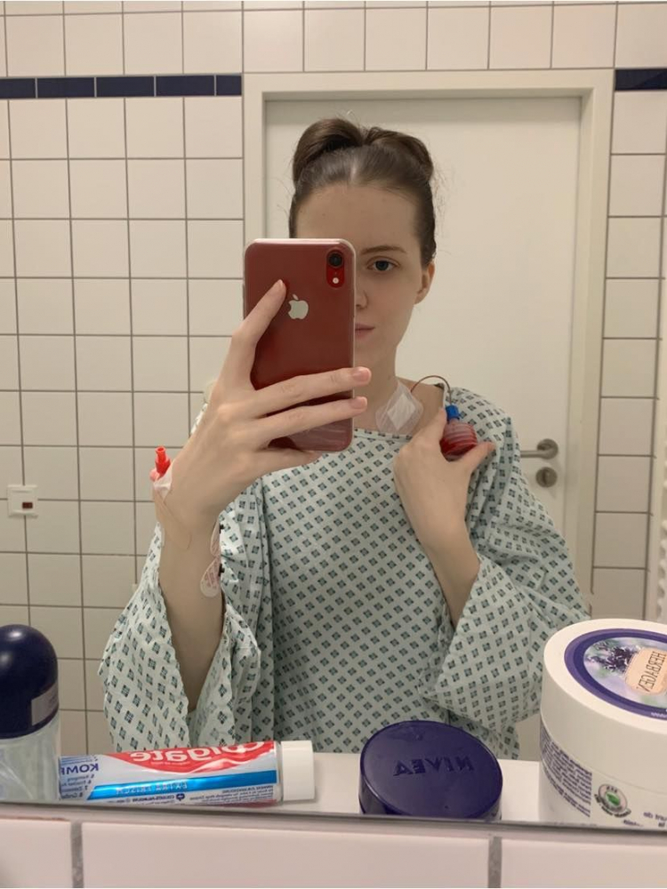 Ecaterina a postat o fotografie in fata oglinzii din spitalul in care este internata. Aceasta are un drenaj la gat, iar din cauza lui este ragusita, spune ea.