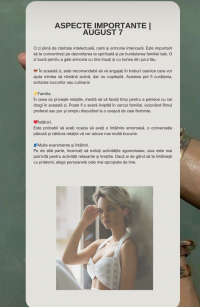 Numerologul Alisa Babin a dezvăluit că ziua de 7 august este: „O zi plină de claritate intelectuală, calm și armonie interioară. Este important să te concentrezi pe dezvoltarea ta spirituală și pe bunăstarea familiei tale. O zi bună pentru a găsi armonia cu tine însăți și cu lumea din jurul tău”.