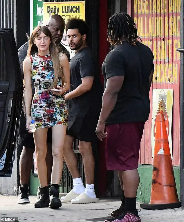 Abel purta un tricou negru, pantaloni scurti, sosete albe si slapi Yeezy bej, iar iubita lui a aparut intr-o rochie mini, mulata pe corp si adidasi negri masivi.