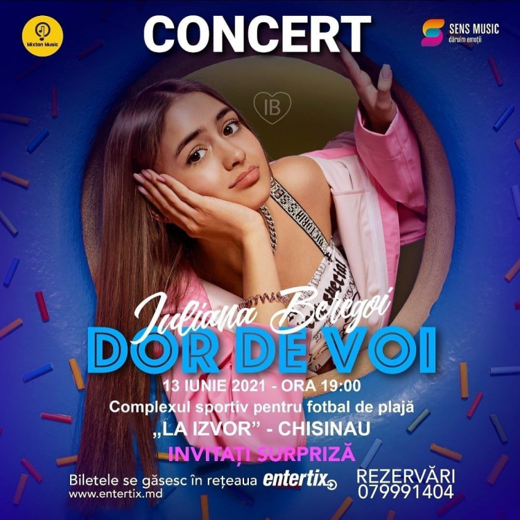 „Primul concert care o sa il am o sa fie in Chisinau. In parcul „La Izvor”, acolo este un stadion nou, care s-a deschis acum momentan si o sa facem acolo concertul. Va fi un concert foarte special pentru mine, care va avea loc ppe data de 13 iunie. Astept aceasta intalnire cu admiratorii si fanii mei”, dezvaluie Iuliana Beregoi.