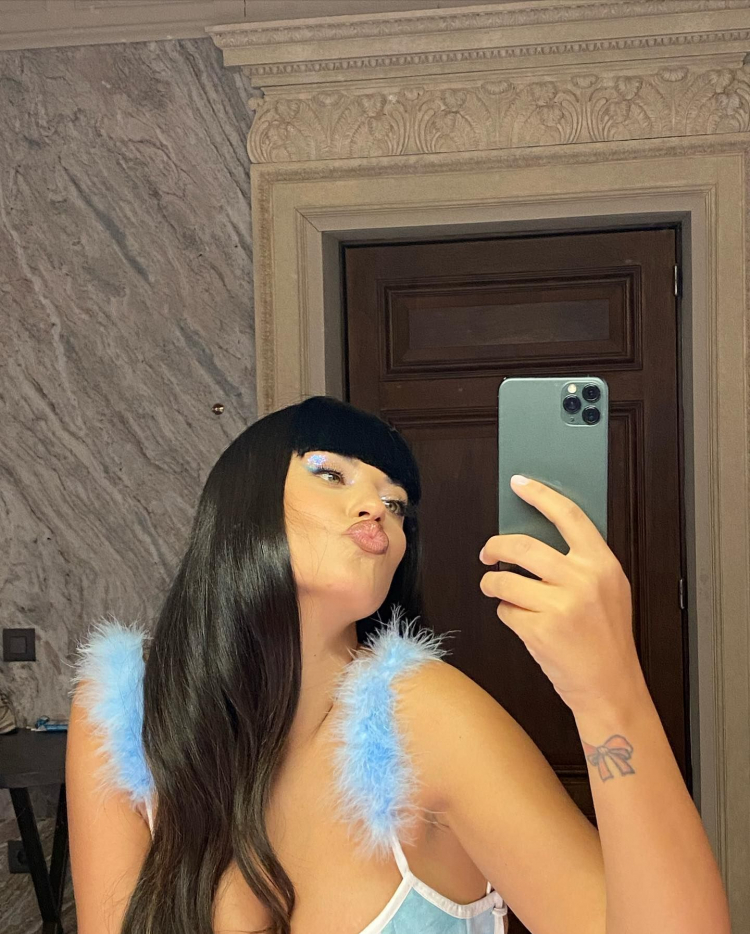 In urma cu putin timp, cantareata s-a fotografiat intr-o pereche de jeansi largi, pe care i-a asortat cu un top mulat, ce are bretele din pene, iar in partea din fata are imprimat o pisica.