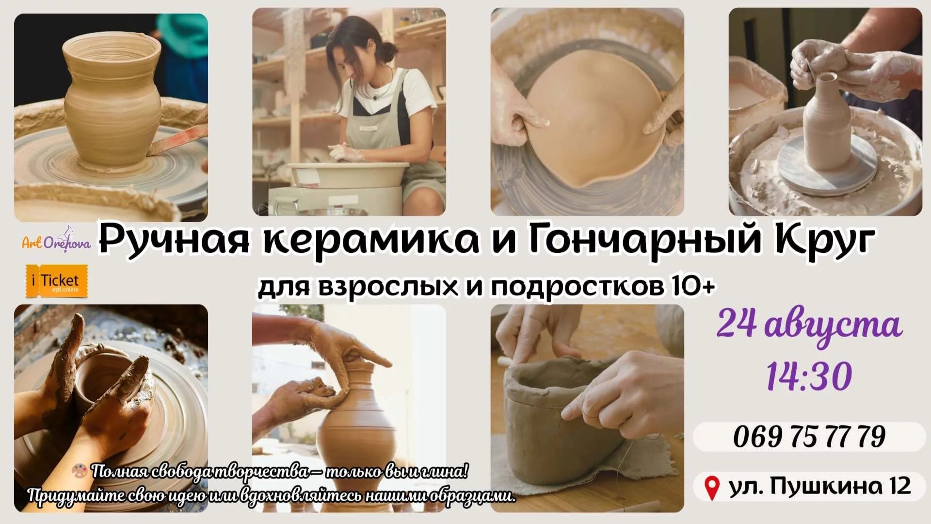 În Chișinău, pe strada Pușkin 1, pe 24 august, de la ora 14:30, va avea loc un atelier de olărit, predat în limba rusă, pentru adulți și adolescenți. Participanții vor crea două obiecte din ceramică, unul manual și unul pe roata olarului, fără a fi necesară experiență anterioară.