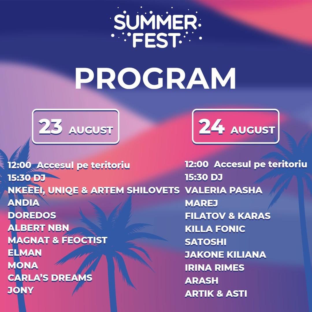 Summer Fest 2025 revine pe 23 și 24 august la Grădina Botanică din Chișinău, aducând două zile de muzică live, distracție și activități pentru toate vârstele. Pe scenă vor urca artiști precum Arash, Carla's Dreams, Irina Rimes, Jony, Andia, Artik & Asti și mulți alții. Festivalul oferă zone de relaxare, food court și un vibe de neuitat.