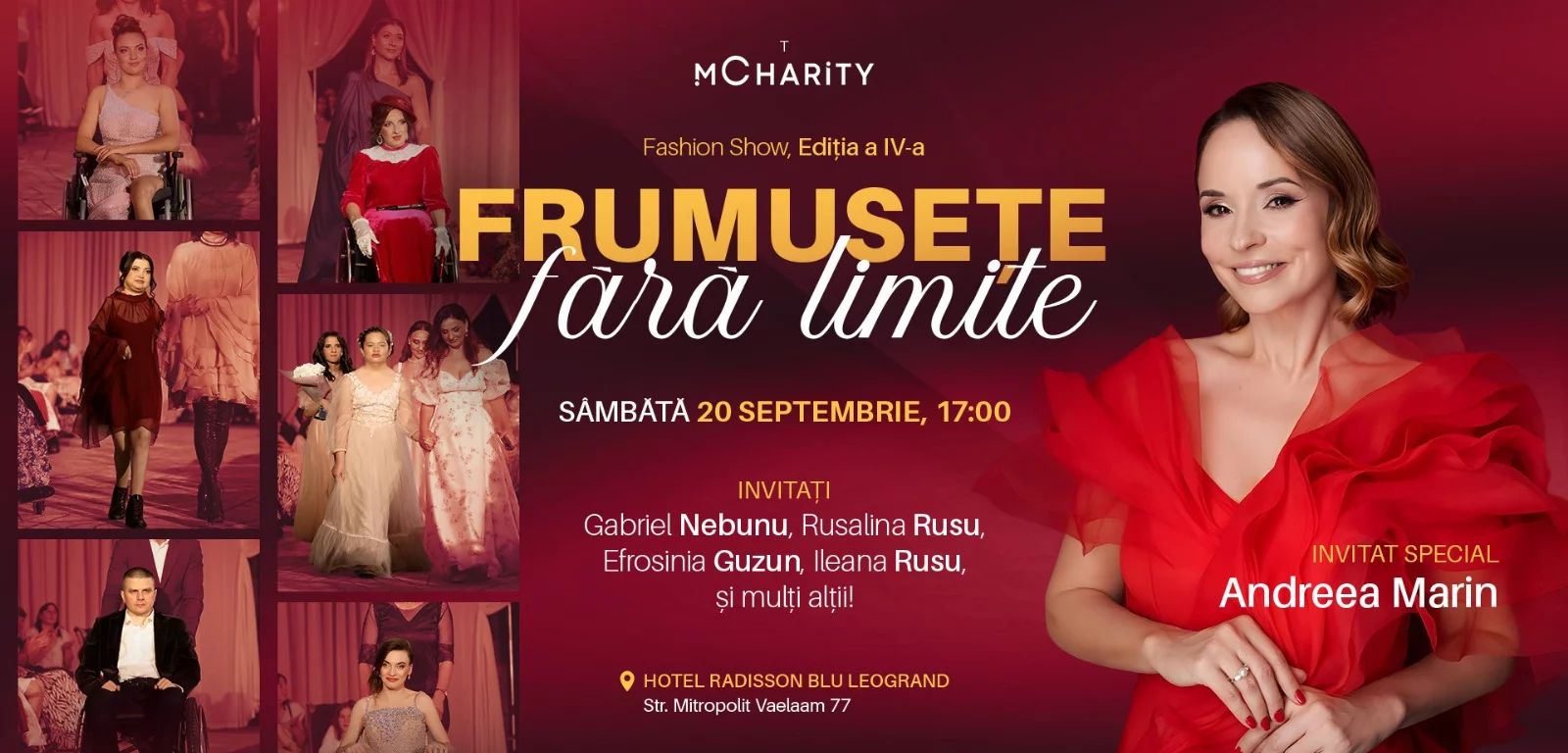 „Frumusețe Fără Limite” are loc sâmbătă, 20 septembrie, de la ora 17:00, la Radisson Blu Leogrand Hotel din Chișinău. Evenimentul aduce pe scenă 15 persoane care își spun povestea prin modă, susținute de 15 personalități publice, într-un spectacol emoționant despre curaj, incluziune și frumusețe autentică. Gazda serii este Andreea Marin.