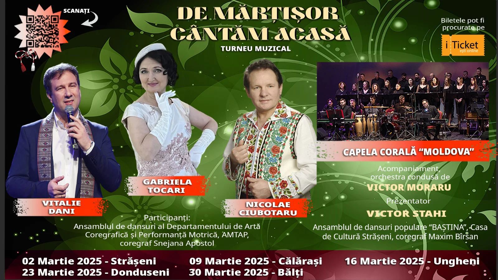 La Dondușeni (Casa de Cultură), pe 23 martie, la ora 14:00, ești invitat să celebrezi Mărțișorul printr-un spectacol muzical de excepție, parte din Turneul Național „De Mărțișor cântăm acasă”. Artiști de renume, precum Vitalie Dani, Gabriela Tocari, Nicolae Ciubotaru și Victor Stahi, vor aduce pe scenă un concert 100% live, în care tradiția se îmbină cu sonorități moderne. Evenimentul promite premiere muzicale, melodii de altădată cu un twist modern, dansuri și momente artistice speciale.