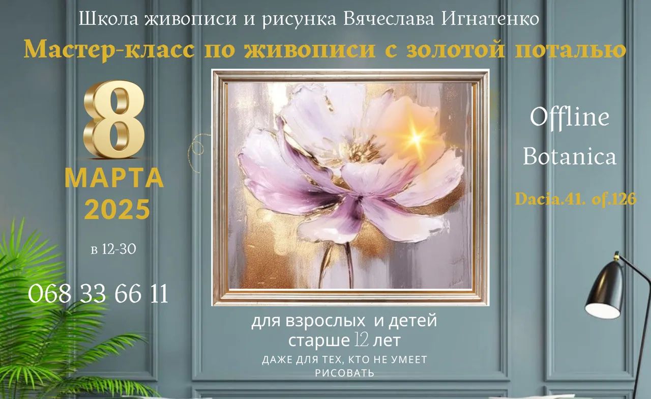 Pe 8 martie, sărbătoriți într-o atmosferă creativă la un masterclass de pictură cu foițe de aur, susținut de artistul moldovean Veaceslav Ignatenco. Cursul, destinat tuturor celor care vor să învețe să picteze, va dura 3 ore și va include toate materialele necesare: pânză, vopsele acrilice, foițe de aur, pensule și multe altele. La final, fiecare participant va pleca cu o lucrare personală. De asemenea, veți avea parte de un coffee break și un pahar de vin.