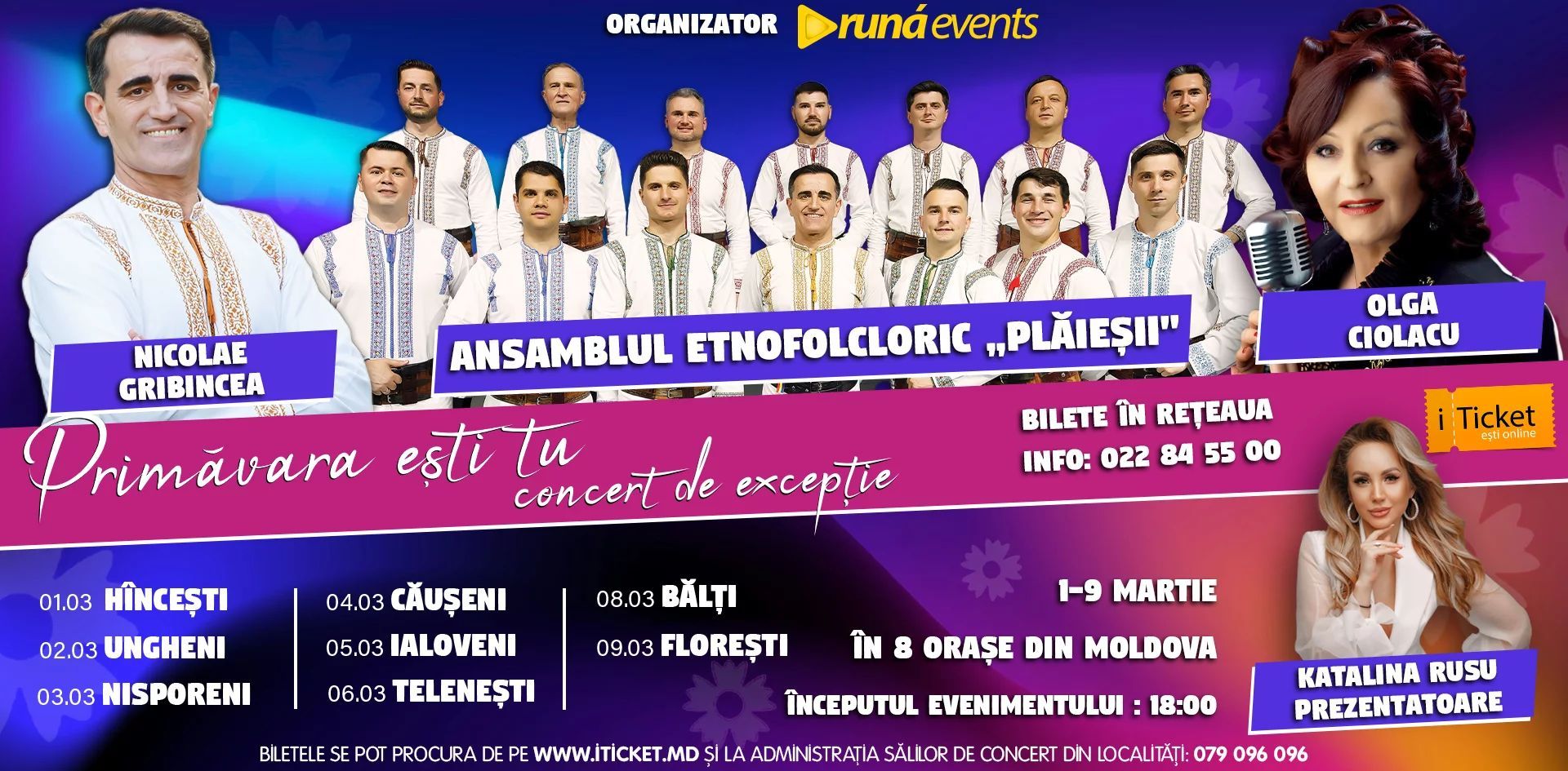 Ești invitat să sărbătorești FEMEIA și frumusețea primăverii, la două concert de excepție, cu muzică autentică și tradiție, în cadrul spectacolului „Primăvara ești Tu”. Pe scenă vor evolua Olga Ciolacu, Ansamblul etnofolcloric „PLĂIEȘII” cu Nicolae Gribincea și Katalina Rusu (prezentatoare).