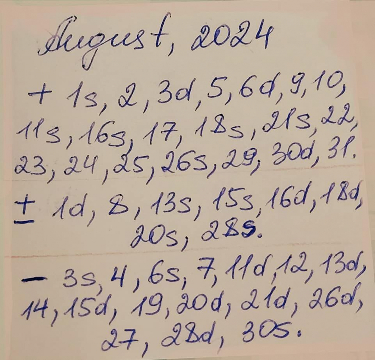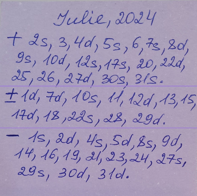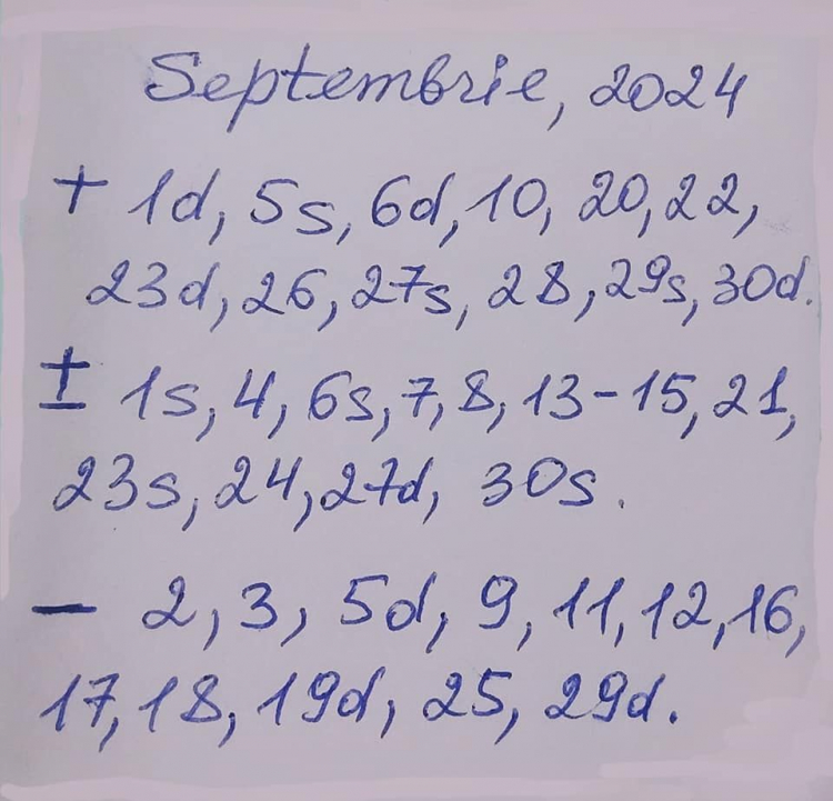 Astrologul a explicat totodată care zile din lunile iulie, august, dar și septembrie sunt: pozitive, negative, dar și neutre: „Va reamintesc: în zile cu + putem face orice, sunt zile pozitive, norocoase, bune pentru tot. În zile cu - trebuie să fim cuminței și toleranți, mai mult cu griji mici, fără situații riscante, ocolim hotărârile importante, inclusiv călătoriile anevoioase. Se agravează îmbolnăvirile cronice, nu e timp potrivit pentru operații, vaccinare. Le ocolim, dacă e posibil. Cele cu +- sunt nici rele, nici prea bune, depinde de comportamentul fiecăruia. S - seara. D - dimineața”.