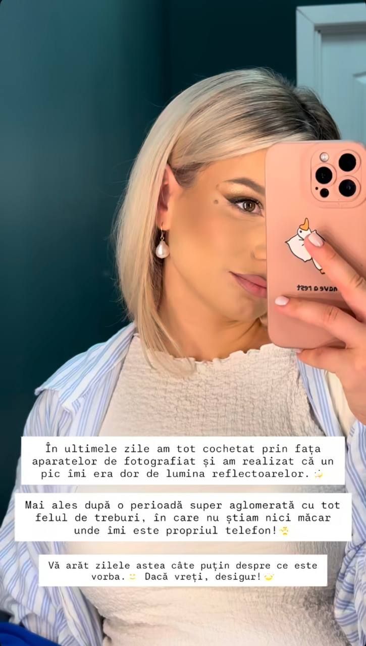 „În ultimele zile am tot cochetat prin fața aparatelor și am realizat că un pic îmi era dor de lumina reflectoarelor. Mai ales după o perioadă super aglomerată cu tot felul de treburi, în care nu știam nici măcar unde îmi este propriul telefon”.