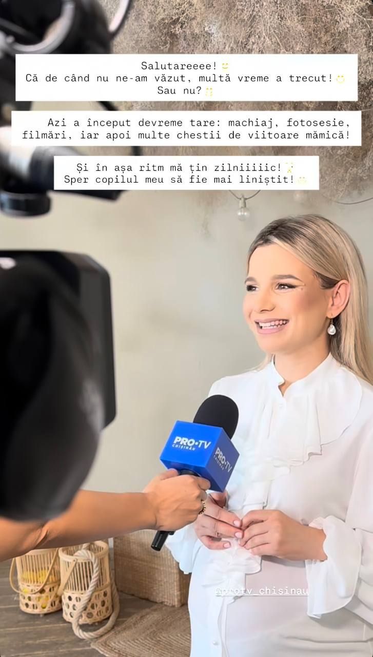 „Azi a început devreme tare: machiaj, fotosesie, filmări, iar apoi multe chestii de viitoare mămică! Şi în așa ritm mă țin zilnic! Sper copilul meu să fie mai liniştit”.