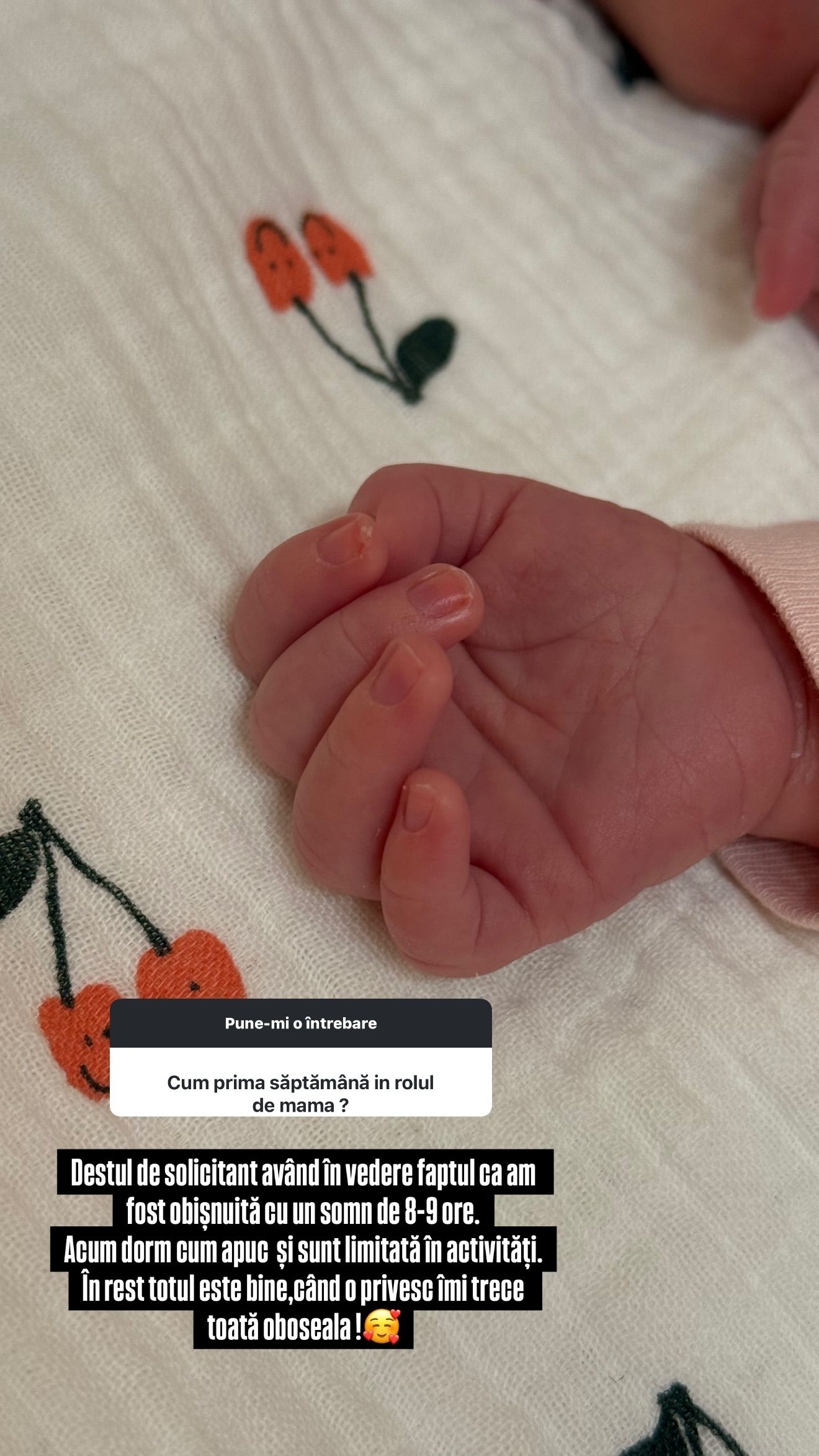 Într-un alt InstaStory, Nichita a menționat kilogramele fetiței la naștere: „3.050 kilograme, 50 centimetri și 38 săptămâni și 5 zile”.