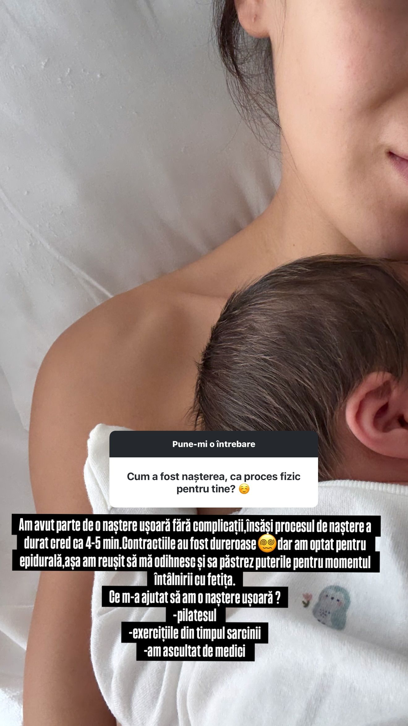 De asemenea a povestit cum a fost procesul nașterii pentru ea:„Am avut parte de o naștere uşoară fără complicații, însăşi procesul de naştere a durat cred că 4-5 min. Contracțiile au fost dureroase, dar am optat pentru epidurală, așa am reuşit să mă odihnesc și să păstrez puterile pentru momentul întâlnirii cu fetița. Ce m-a ajutat să am o naştere uşoară? Pilatesul. Am ascultat de medici”.