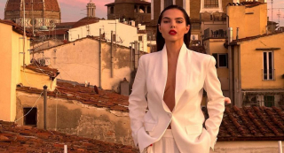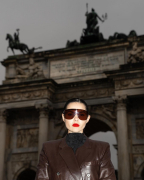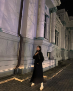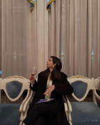Pentru un plus de culoare si rafinament, fashion bloggerita a ales sa-si dea buzele cu ruj rosu, dar si sa poarte cercei rotunzi, supradimensionati, de culoare aurie.