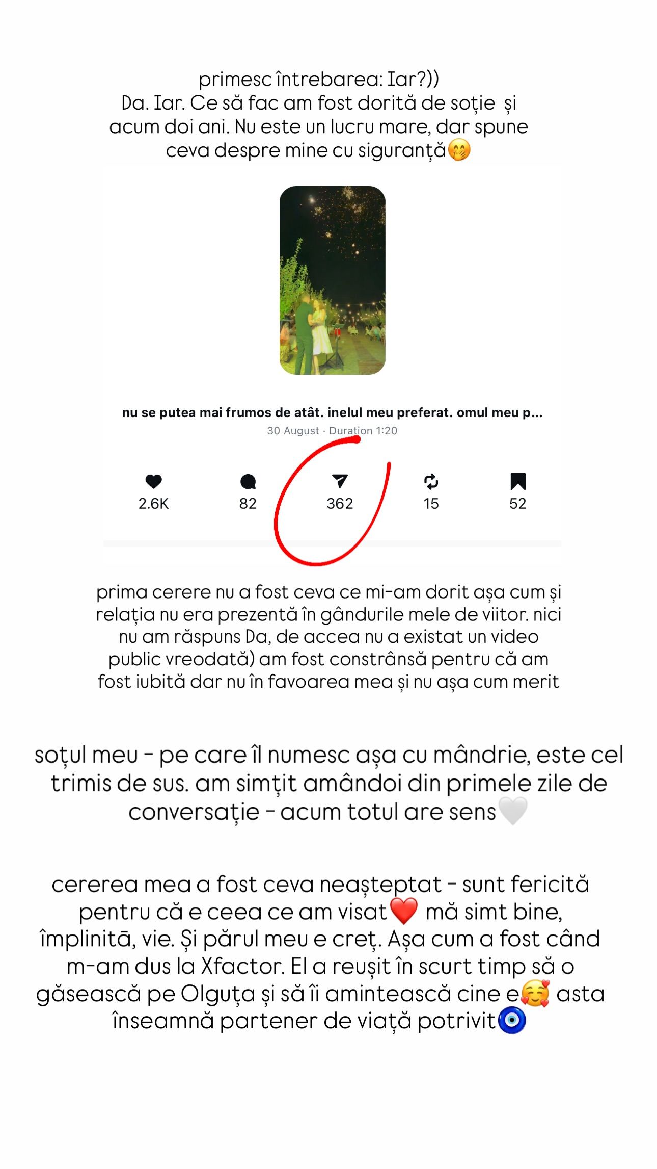 „Soțul meu pe care îl numesc așa cu mândrie este cel trimis de dus, am simțit amândoi din primele zile de conversație - acum totul are sens. Cererea mea a fost ceva neașteptat. Sunt fericită pentru că, e ceea ce am visat. Mă sim bine, împlinită, vie și părul meu e creț așa cum a fost când m-am dus la XFactor. El a reușit în scurt timp să o găsească pe Olguța și să îi amintească cine e. Asta înseamnă partener de viață potrivit”, a completat Olga.