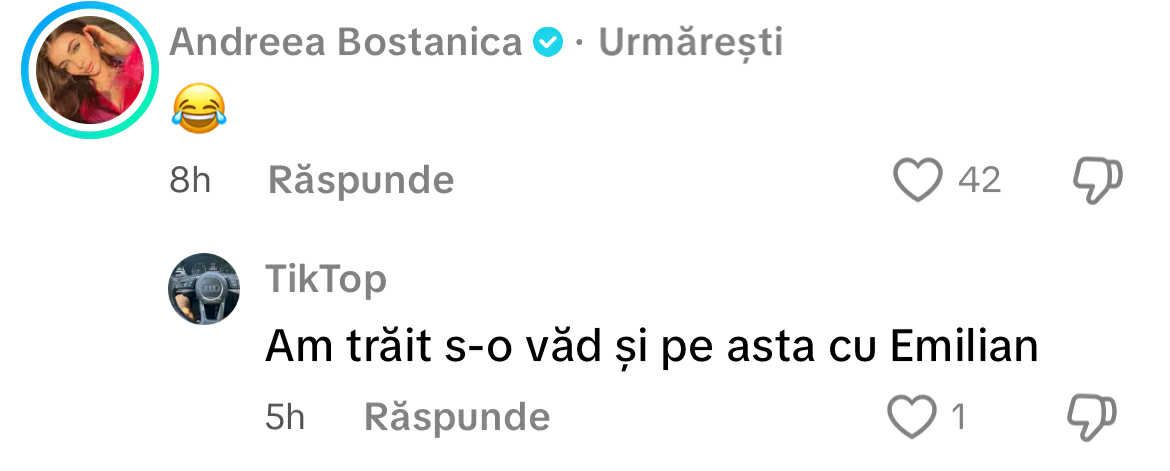 Nici Andreea Bostanica nu a trecut cu vederea seria de fotografii. Reacția ei a fost una demnă: a postat un emoticon care râde cu lacrimi.