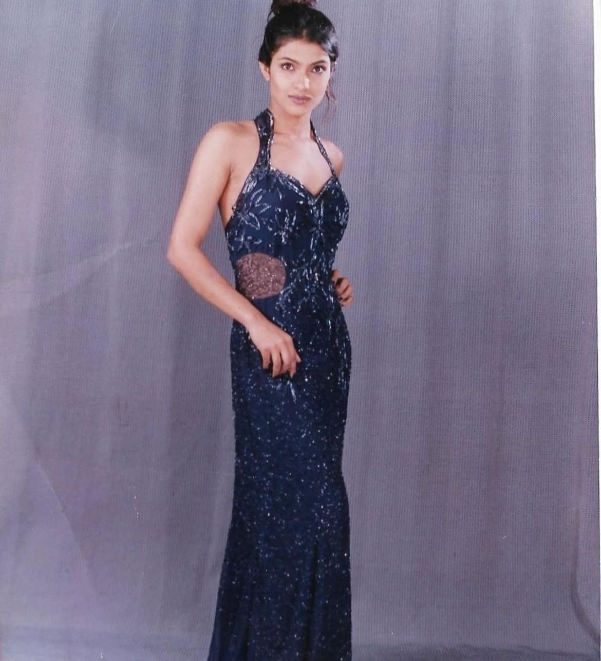 Într-o altă fotografie indiaca apare într-o rochie de seară cu părul prins în coc. Vedeta le-a spus fanilor că este vorba de „prima mea ședință foto de modelling în Bareilly. Coafură și machiaj realizate de mine. 1999”.