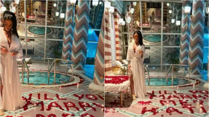 Fotografiile obținute de The Sun arată un cadru izbitor de familiar: petale de trandafiri pe podea, lumânări, mesajul „Will you marry me?”, halate albe, buchete uriașe de trandafiri roșii și un hotel de lux din Dubai. Practic, același scenariu romantic tras la indigo, doar protagonista diferă.
