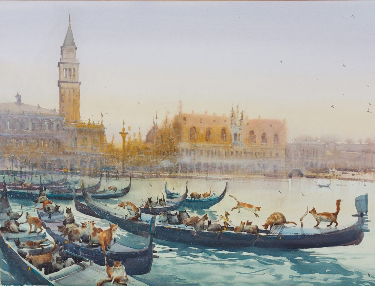 „Mai intai, recunosc ca am avut diverse prejudecati fata de pictura in acuarela. Habar n-am de ce, din motive stupide, probabil. In timp, din fericire, se mai diminuasera oricum. Dar cred ca toate prejudecatile astea mi-au fost spulberate definitiv abia dupa ce am descoperit pictura lui Eugeniu Gorean, artist din Chisinau. Am ales sa postez aici patru imagini ale unor lucrari (imagini preluate de pe pagina sa publica de artist): primele trei, dintr-o serie fenomenala dedicata pandemiei, in care oamenii lipsesc cu desavarsire din locuri in mod obisnuit aglomerate, fiind inlocuiti de-o invazie de animale sau pasari; o a patra, un peisaj care-mi place enorm. Despre artist pot sa va spun ca, din cate am putut sa observ, a expus pana acum doar in strainatate (cel putin daca vorbim despre expozitii personale), fiind foarte apreciat. Cu toate astea, este inca tanar, nici nu spun cat de tanar. Pe mine lucrarile lui m-au obsedat inca de la prima vedere.”, sustine el.
