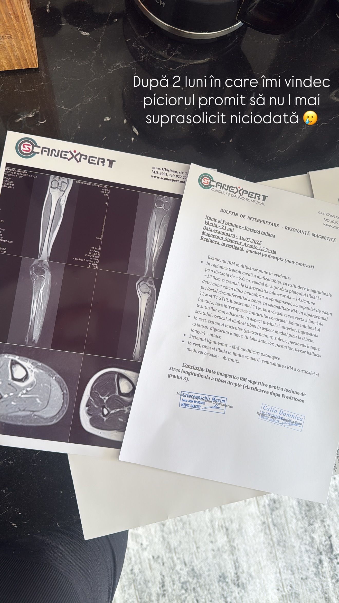 După luni întregi de antrenamente intense, vedeta a fost nevoită să ia o pauză din cauza unei fracturi la nivelul tibiei, o afecțiune des întâlnită în rândul sportivilor și al persoanelor care practică activități fizice cu impact repetitiv.