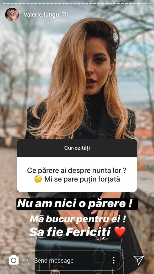 Intrebata de un urmaritor ce parere are despre nunta fostului ei iubit si daca aceasta nu ii pare putit fortata, Valeria a marturisit ca: „Nu am nicio parere! Ma bucur pentru ei. Sa fie fericiti.”