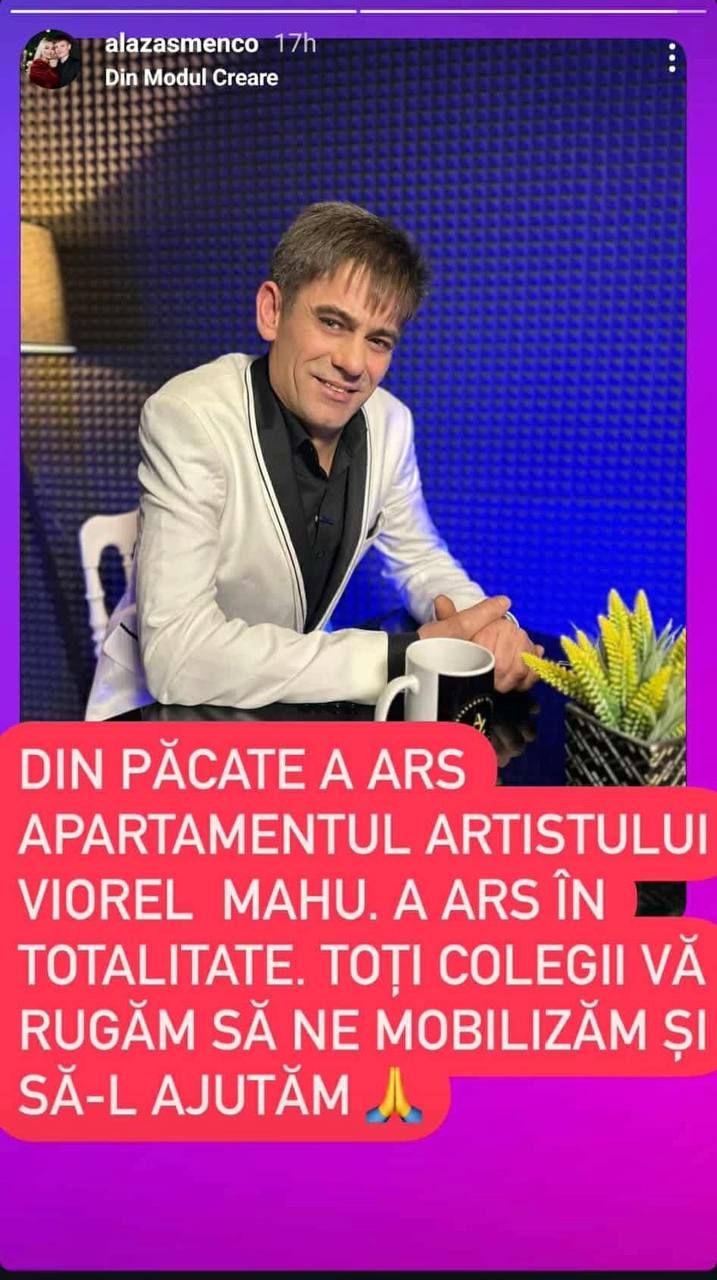 „Din păcate a ars apartamentul artistului Viorel Mahu. A ars în totalitate. Vă rugăm să ne mobilizăm și să-l ajutăm”.