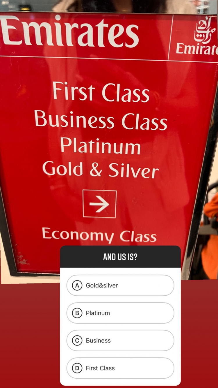 De curand, ea a publicat o poza din avion, unde se afla la clasa intai si a scris: „Dream high! Like me. It really works” adica „ Viseaza mult, ca mine. Chiar functioneaza.”