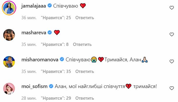 In comentarii la postarea sa, Alan a primit sute de mesaje frumoase de la urmaritorii sai, printre care s-au numarat si unele celebritati ucrainene - Jamala si Misha Romanova, precum si fotografa Sonia Plakidiuk.
