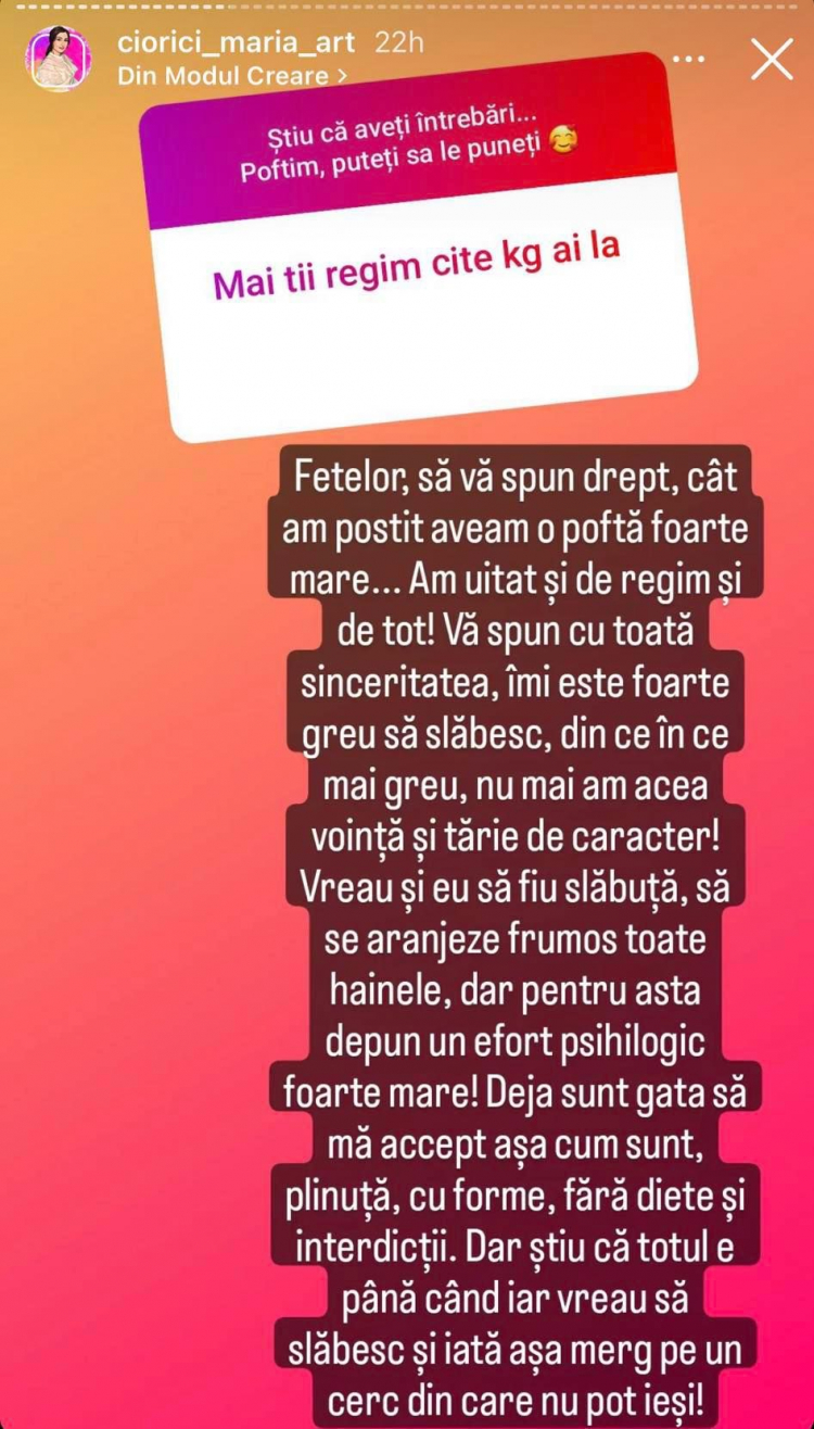 „Fetelor, va spun drept, cat am postit aveam o pofta foarte mare. Am uitat si de regim si de tot. Va spun cu toata sinceritatea, imi este foarte greu sa slabesc, din ce in ce mai greu, nu mai am acea vointa si tarie de caracter. Vreau si eu sa fiu slabuta, sa se aranjeze frumos toate hainele, dar pentru asta depun un efort psihologic foarte mare! Deja sunt gata sa ma accept asa cum sunt, plinuta, cu forme, fara diete si interdictii. Dar stiu ca totul e pana cand iar vreau sa slabesc si iata asa merg pe un cerc din care nu pot iesi.”, a povestit cu sinceritate Ciorici intr-un InstaStory.