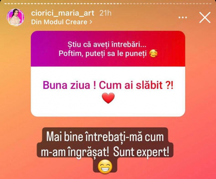 De asemenea, intr-un alt InstaStory, interpreta a mai spus: „Mai bine intrebati-ma cum m-am ingrasat. Sunt expert.”