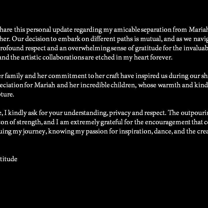 „Cu emotii amestecate, impartasesc aceasta actualizare personala cu privire la separarea mea amiabila de Mariah Carey, dupa sapte ani extraordinari impreuna. Decizia noastra de a porni pe cai diferite este reciproca si o facem cu un respect profund si un sentiment coplesitor de recunostinta pentru timpul nepretuit pe care l-am impartasit. Amintirile pe care le-am creat si colaborarile artistice sunt gravate in inima mea pentru totdeauna. Astept cu nerabdare sa-mi continui calatoria, stiind ca pasiunea mea pentru inspiratie, dans si artele creative va rezona in capitolele care se vor derula”, a scris el pe Instagram.