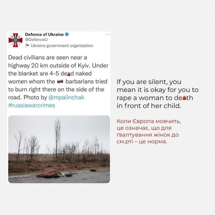 „Nu am cuvinte sa descriu acest genocid. Scriu aceste cuvinte si plang. Acum Rusia vrea sa distruga intreaga natiune ucraineana. Ei violeaza, ucid, distrug si tortureaza. Avem nevoie de ajutor, trebuie sa oprim aceasta groaza. Nu poate fi adevarat in secolul al XXI-lea. Nimeni nu merita asta. Sunt distrusa mintal. Inima mea sangereaza, nu mai am mila. Urasc Rusia! ”, a scris artista.