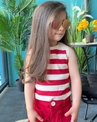 Svetlana Sainsus isi filmeaza fetita deseori, in aceasta dimineata, Lia, insa a aparut in story-ul mamei sale cu ochelarii de soare pe ochi, intr-un tricou in dungi albe si rosii, in pantaloni scurti de culoare rosie si in dressuri albe.