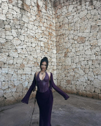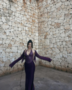 Pentru prima zi de vacanta, Bezer a imbracat un look format din trei piese, de culoarea violeta.