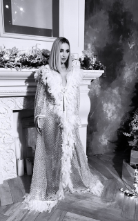 Vedeta avea pe ea doar lenjerie intima, de culoarea alba, iar deasupra un peignoir transparent si stralucitor, ornamentat cu pene albe.