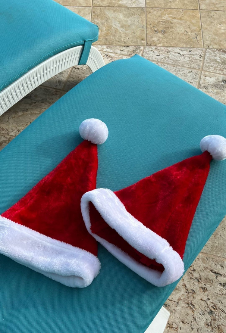 Cu ocazia Revelionului, cuplul a optat pentru culoarea rosie. Vlad a imbracat o pereche de sorti de plaja si o caciulita de Mos Craciun, iar Marinela a optat pentru un costum de baie intreg si, la fel, o caciulita de Craciunita.