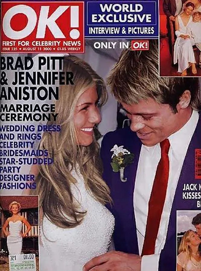 Actorii s-au casatorit pe 29 iulie 2000. Ceremonia a avut loc la un conac luxos din Malibu. Tinuta miresei de la Lawrence Steele a costat 50.000 de dolari, iar smoking-ul mirelui de la Yves Saint Laurent a costat 4.000 de dolari. Printre invitatii vedete s-au numarat Salma Hayek, Cameron Diaz si multi altii. Sarbatoarea s-a incheiat cu un foc de artificii grandios, pe care Brad si Jen au cheltuit aproximativ 20.000 de dolari. Tinerii casatoriti au fost, de asemenea, nevoiti sa pastreze intimitatea si anonimatul nuntii - au platit 100.000 de dolari pentru o securitate sporita.
